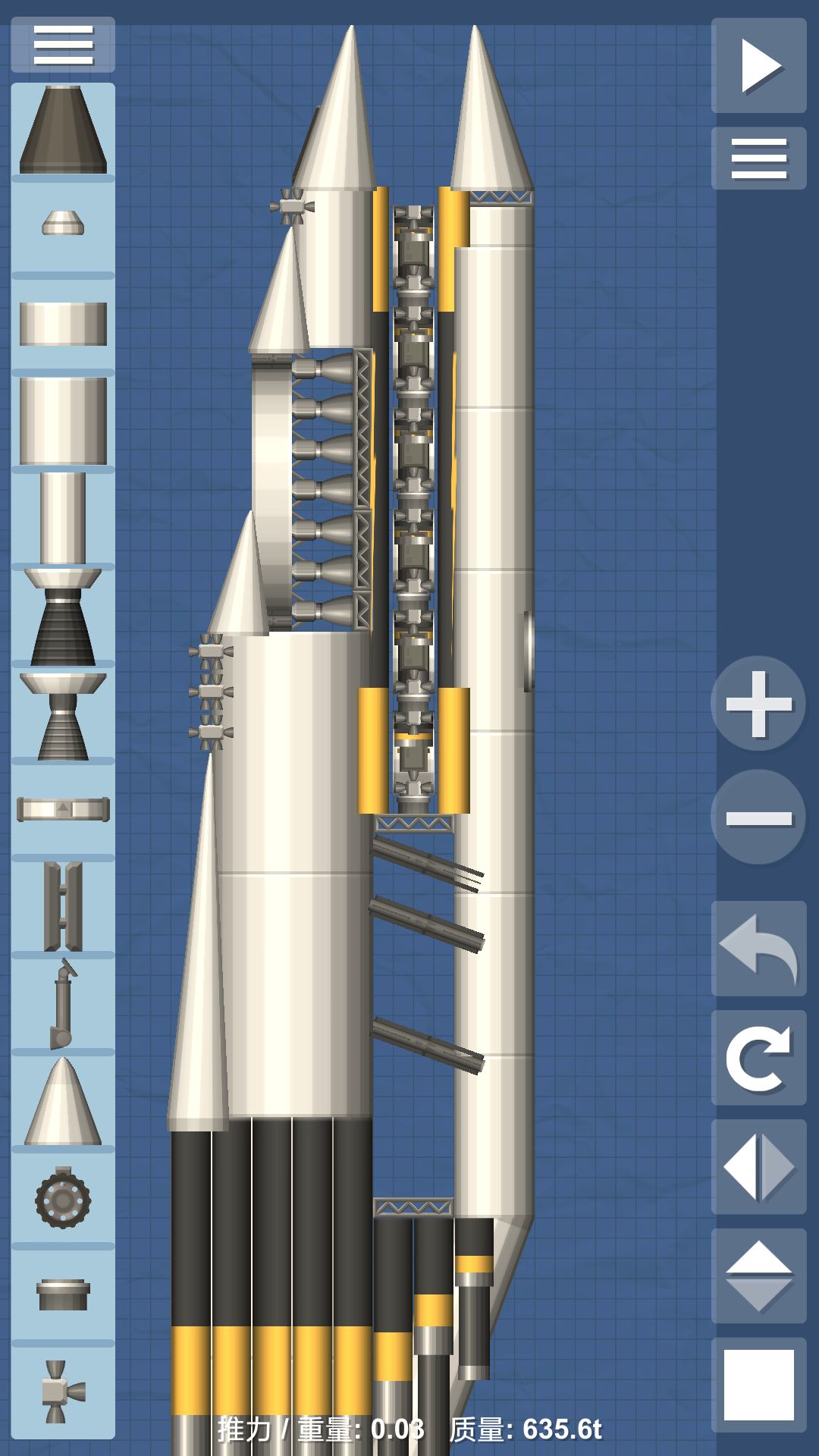 首先,你的飞船要是想要入轨,必须要分级。那么如何分级呢?只要把连接器放在油箱下方,再在它和油箱之间插入引擎就行了。关于引擎的选择,最底下的几级优先选择推力最大的泰坦发动机,载荷部分优先选择效率最高的前沿发动机。同时,如果只看火箭部分的话,你的推重比最好要达到3以上,这样火箭才有足够的燃料入轨。同时载荷部分尽量不要超过火箭部分的1/5,否则就很难推动或者因为重心问题很难控制。如果你想要做一个漂亮一点的火箭,你可以把载荷部分用整流罩包起来,但是如果只是为了实用,整流罩是没必要的。毕竟这游戏中飞船不会被热量烧毁。