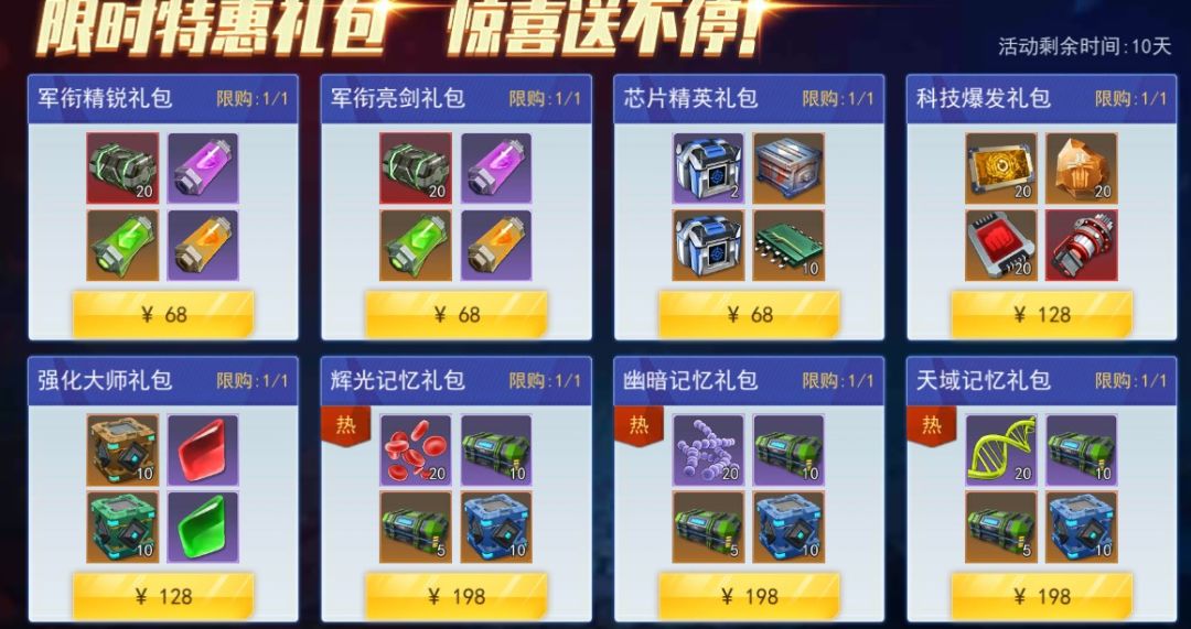 活动三、限时特卖-惊喜不停活动时间:一周活动内容:活动周限时特惠礼包,各种异兽技能道具、宝石、符文、芯片等,让战力持续提升。