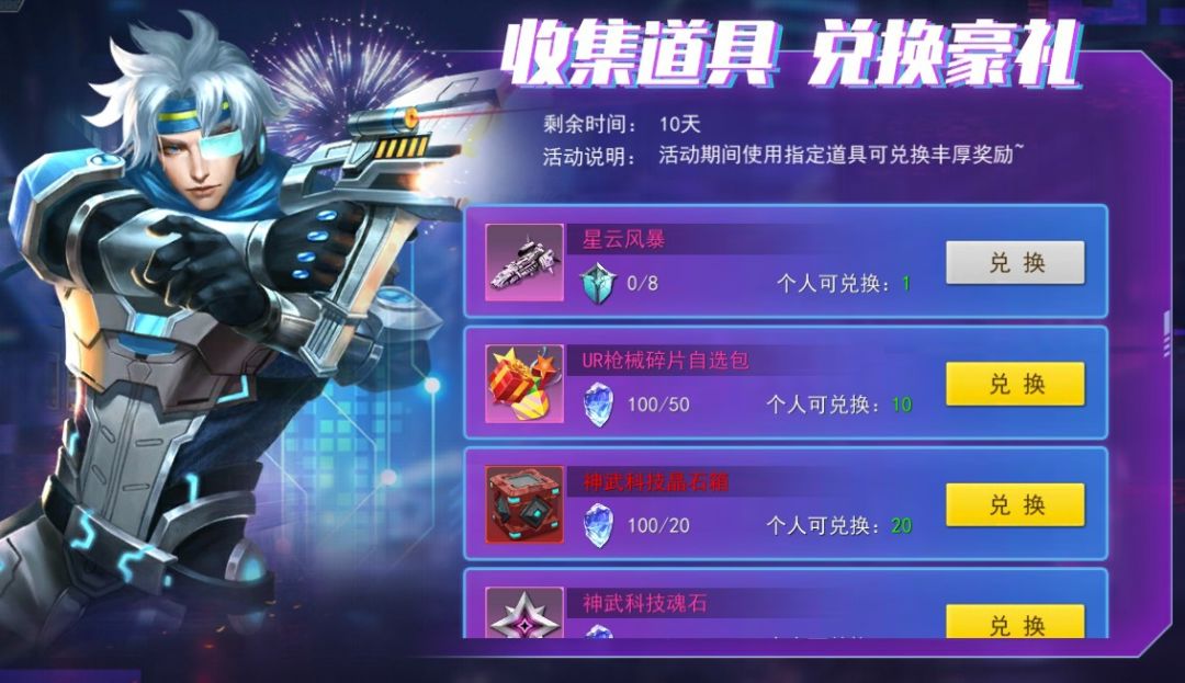 活动六、星灵盛典—超值兑换活动时间:一周活动内容: 使用星晶兑换UR枪械打造及升级道具;使用传说碎片兑换传说级战舰-星云风暴。