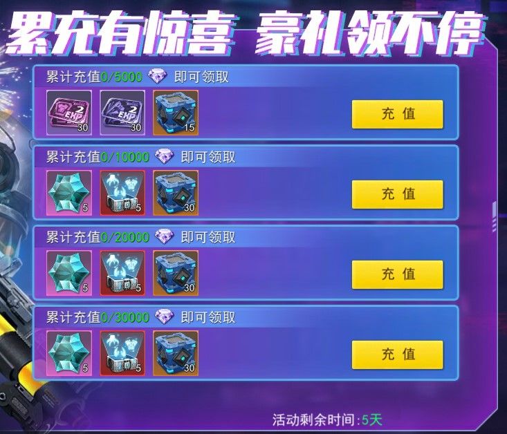 累计充值2000元:异兽星魂*5、异星寻宝箱·极*5、精英矿石箱*30。