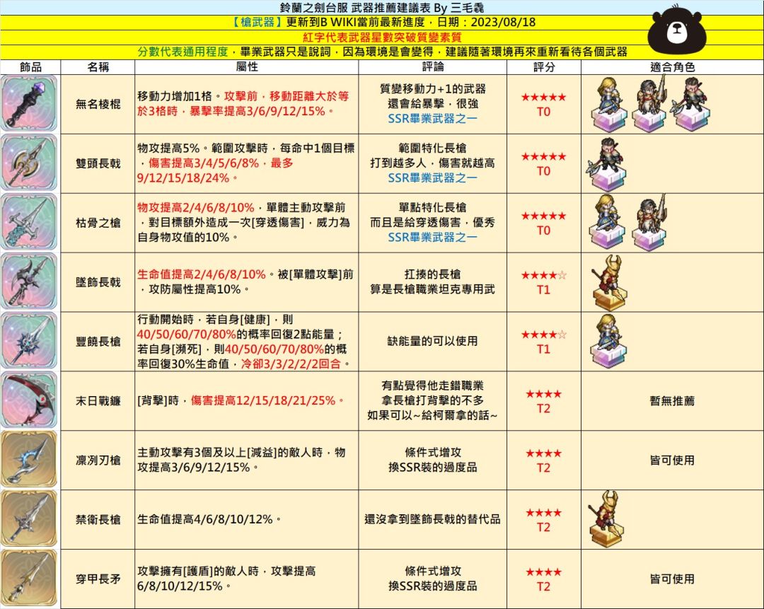 本内容有台服大大三毛毳整理~由于词条蛮久没更新了,莉莉薇儿、诺诺薇儿、伊奇、米格尔、内尔伽勒、伦伽勒、艾达等台服后续的单UP角色不在此表内。