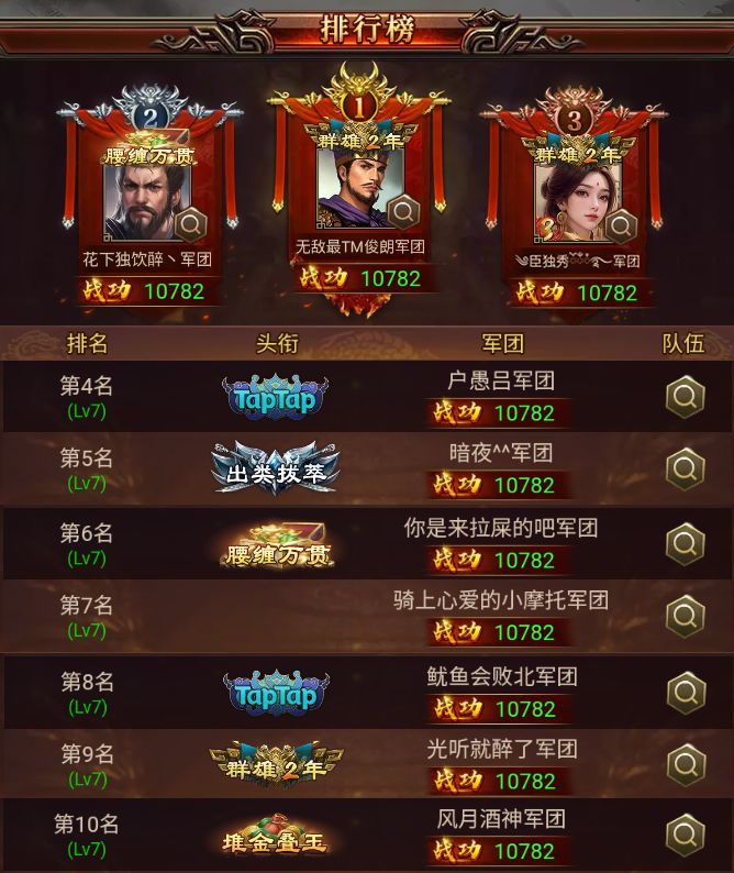 其中,“武将名 x%”代表该历史武将在本次战役的前十玩家中使用率为x%。