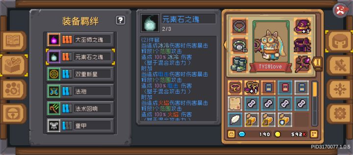 针对“伤害暴击”这一描述,在论坛搜元素石套装效果看到有人理解错了,自己试了一下后解释一下:元素石羁绊生效后,角色头上会有一个属性符号(图片中是雷),火,冰,雷轮流变动,在对应符号时打出对应伤害必定暴击,然后追加一个范围伤害。所以,元素法师毕业套基本就是3+3了(巫师+元素),然后刷羁绊