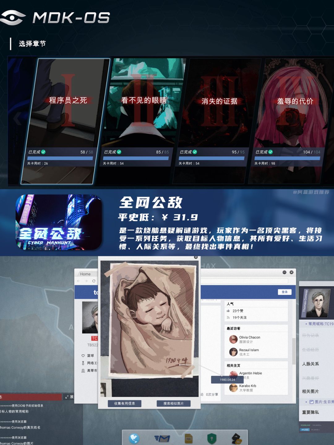 烧脑悬疑解谜游戏,玩家需要收集目标人物的信息,按照要求一点一点抽丝剥茧,最终找到真相