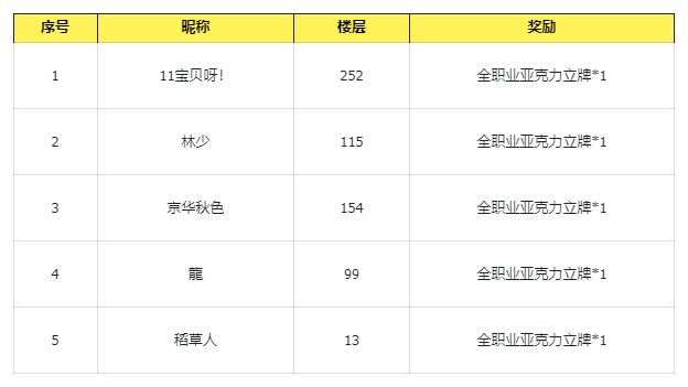 恭喜以下幸运的冒险者获得活动奖励,请中奖的冒险者打开私信功能,工作人员会通过私信联系您,请加获奖群后,登记相关获奖信息,超过7个工作日未登记视为放弃奖励。