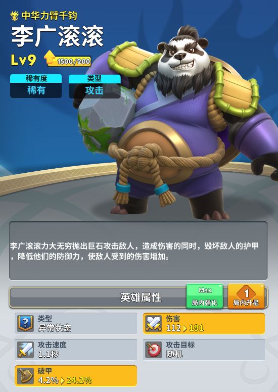 李广滚滚是游戏中唯一具有破甲效果的英雄,由于李广滚滚本身的伤害不高,且攻击目标是随机攻击,在渡过新手期后很多召唤师都会逐渐遗忘这只可爱的熊猫。虽然在对战中李广滚滚很难比肩其他高品质的传说卡和神话卡,但在合作模式中,李广滚滚的破甲效果还是能发挥出巨大的作用。