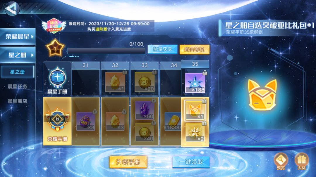活动内容:全新一期星之册开启,30元荣耀手册35级自选突破亚比礼包新增无极