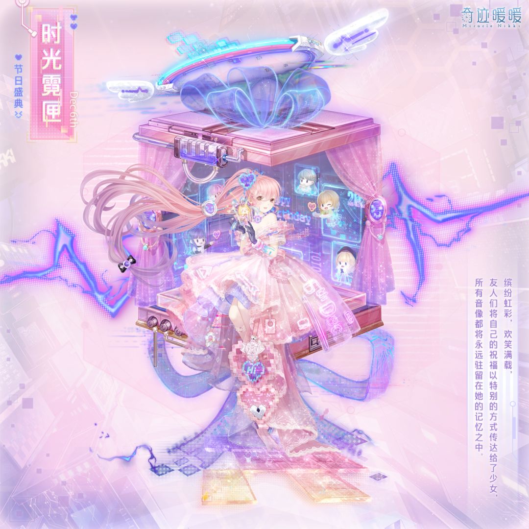【时光霓匣】含正常姿势与特殊姿势,全新妆容“雀跃欢颜”,爱心面饰“天际轻虹”,精美特效摆件“匿影虹匣”,可移动摆件“旅程原点”、“时间使者”、“时空印痕”。