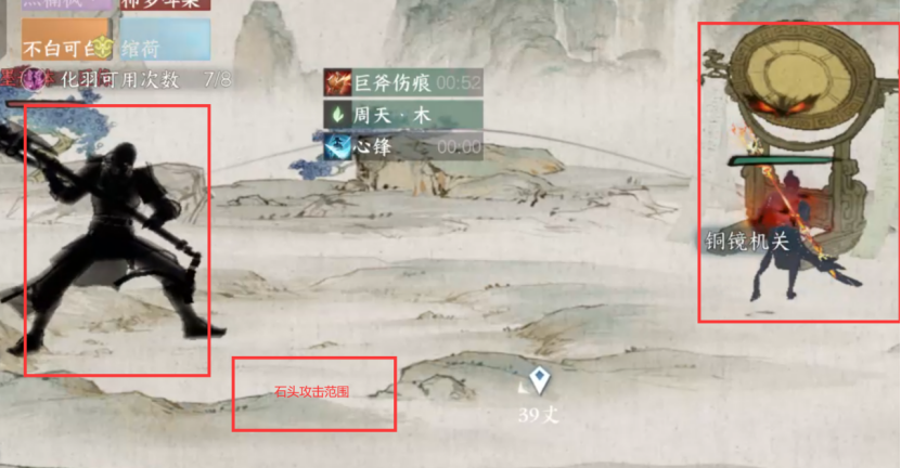 水墨形体-巨像是点名玩家头上会有小眼睛,我们拉到最右边的铜镜这里,看准这个石头的攻击位置,等巨像过来后触发铜镜就行了(大家可以在没开怪的时候提前试一下)