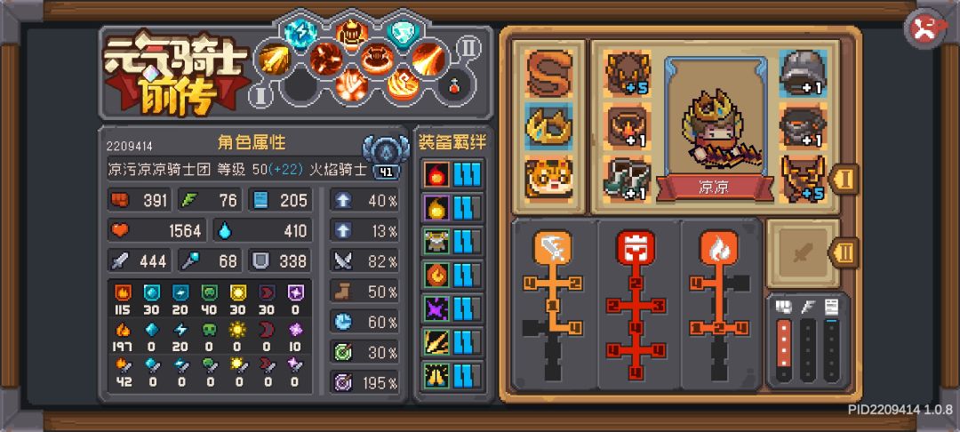 加点全加的力量,技能一开始点了一级自动战意,后来发现蓝耗扛不住,就换了,火骑其实挺随性,没必要太追求啥,把火伤和力量提上去感觉就足够了,我这也是他随机出了这个,玩这个的,一开始黑骑,晶蟹,元素石里挑。
