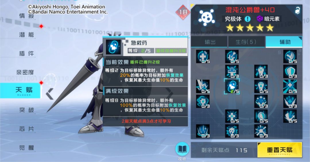 此外,需要注意的是攻击强化(输出类)、 防御强化(生存类)、生命强化(辅助类)将不在面板上显示,已学习此类天赋的数码宝贝更新后会出现面板显示属性降低的情况。