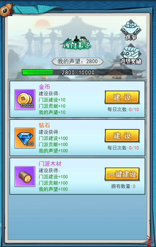 1、玩家加入门派后可通过捐献【金币】【钻石】【木材】建设门派