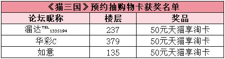 活动时间内,预约《猫三国》并在本帖评论区内晒出你的预约截图,即有机会获得50元天猫超市卡~