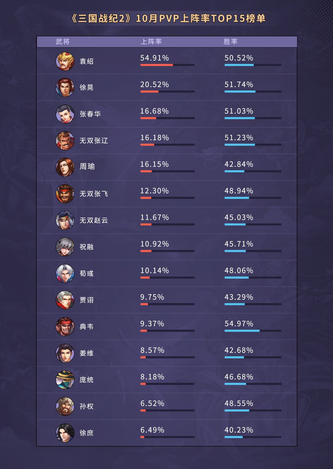 十月武将PVP榜单数据