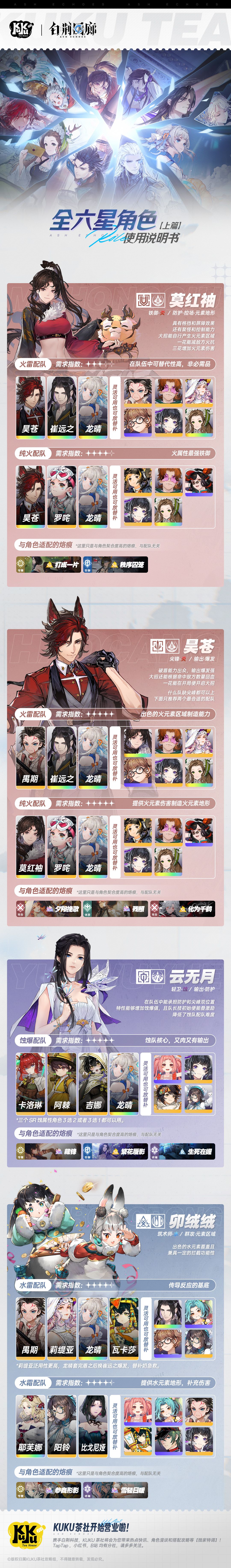 同时,茶社也对四位角色在当前版本中的主流配队以及契合烙痕进行了推荐,方便监督们针对自身的卡池合理规划养成!