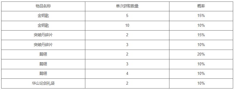 所有玩家每日登陆游戏可领取:华山论剑红包*1,千机券礼盒*2