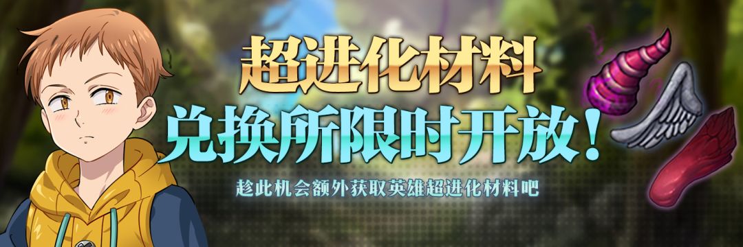 活动介绍:活动期间内限时开放超进化材料兑换所,通过不同种类的超进化材料超值兑换,大幅提升骑士团英雄练度吧!