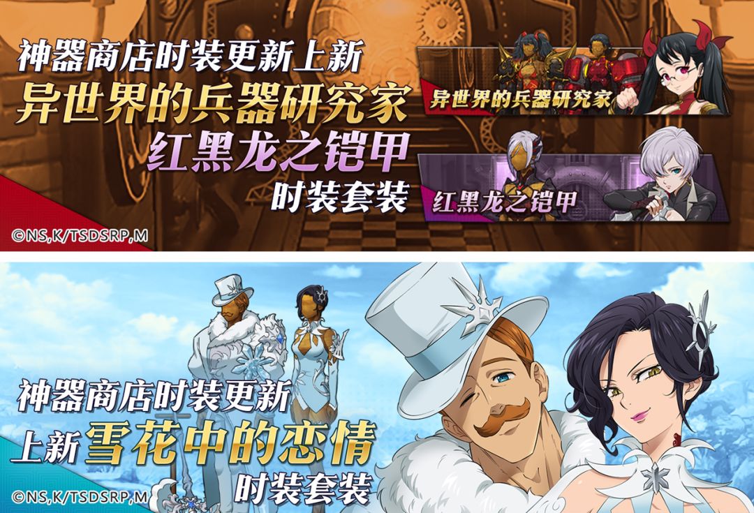 ☛神器商店限时新增“异世界的兵器研究家”、“红黑龙之铠甲”、“雪花中的恋情“时装组合!