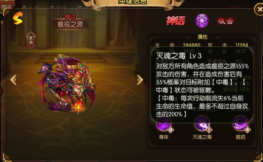 这套阵容以叠毒为主,地狱魔神为核心,地狱魔神的被动效果可以在杀敌的同时给全体队员回复大量的生命值,同时作为毒队伍的核心,对中毒效果提供大量的伤害加成;