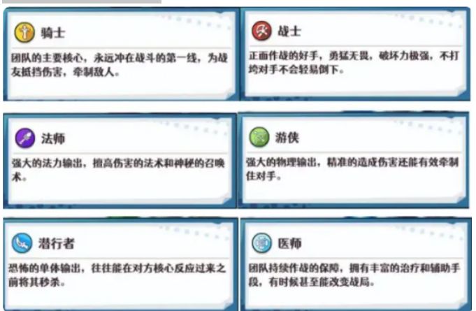 英雄们的职业会分为骑士、战士、法师、游侠、潜行者以及医师。