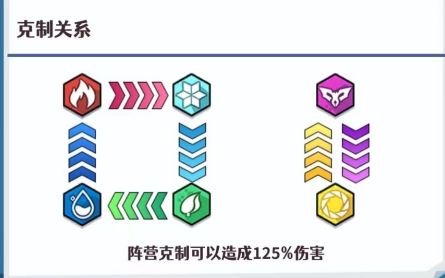元素大陆共分化出光暗火冰草水六种元素,其中火冰草水四大元素构成一个克制循环,光与暗两大元素相生相克互相制约。阵营克制关系可以总计造成125%伤害,例如火元素可以对冰元素造成125%的伤害,冰元素又可以对草元素造成125%伤害。此外光元素可以对暗元素造成125%伤害,暗元素同样可以对光元素造成125%伤害。所以选择正确的属性克制可以令整支远征队达成事半功倍的效果。