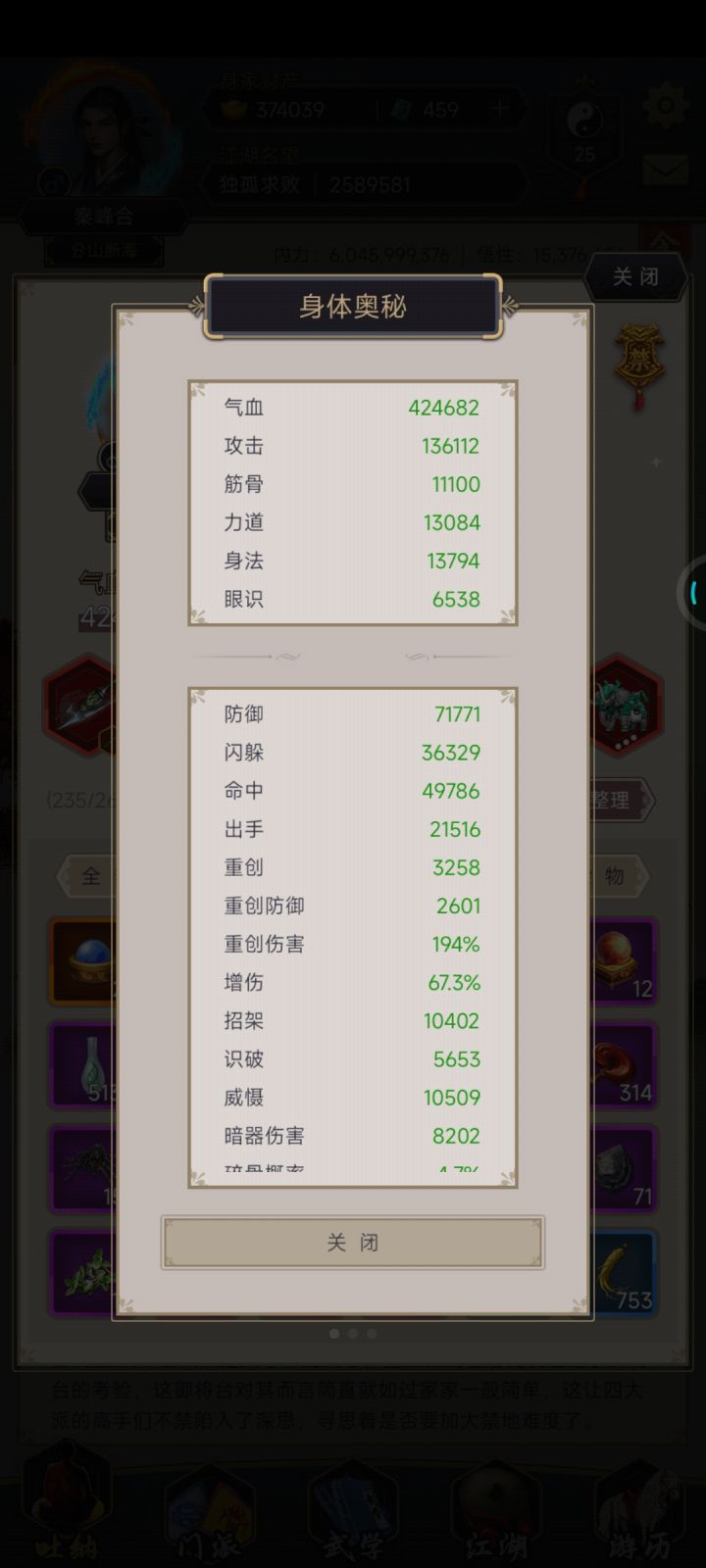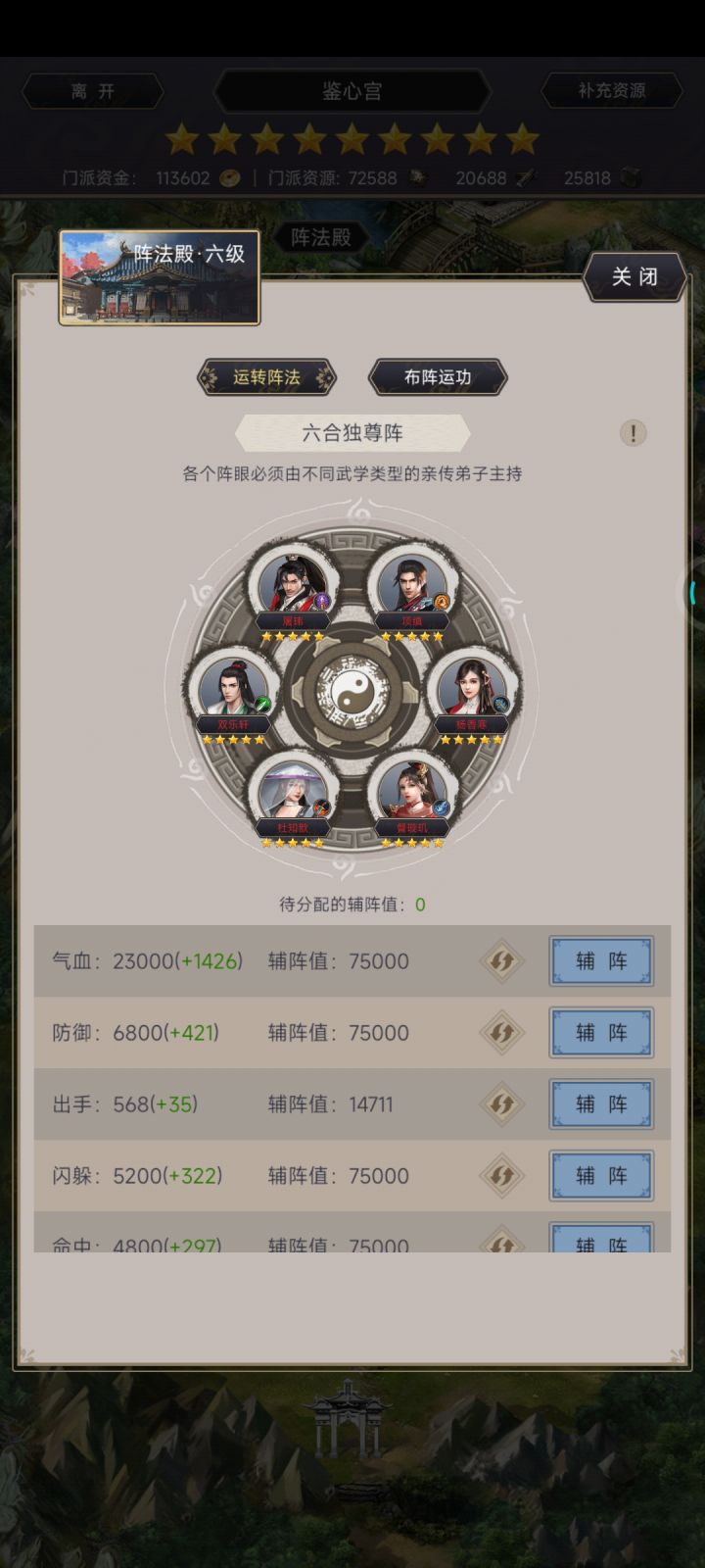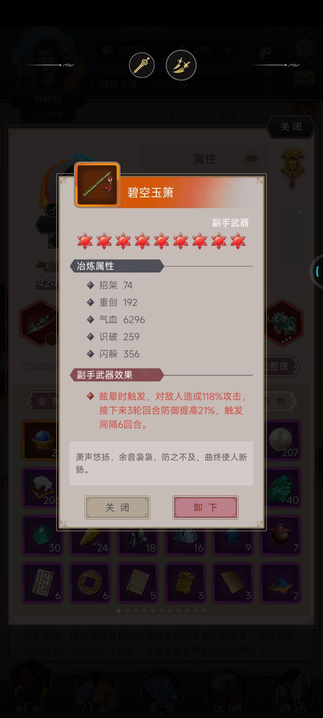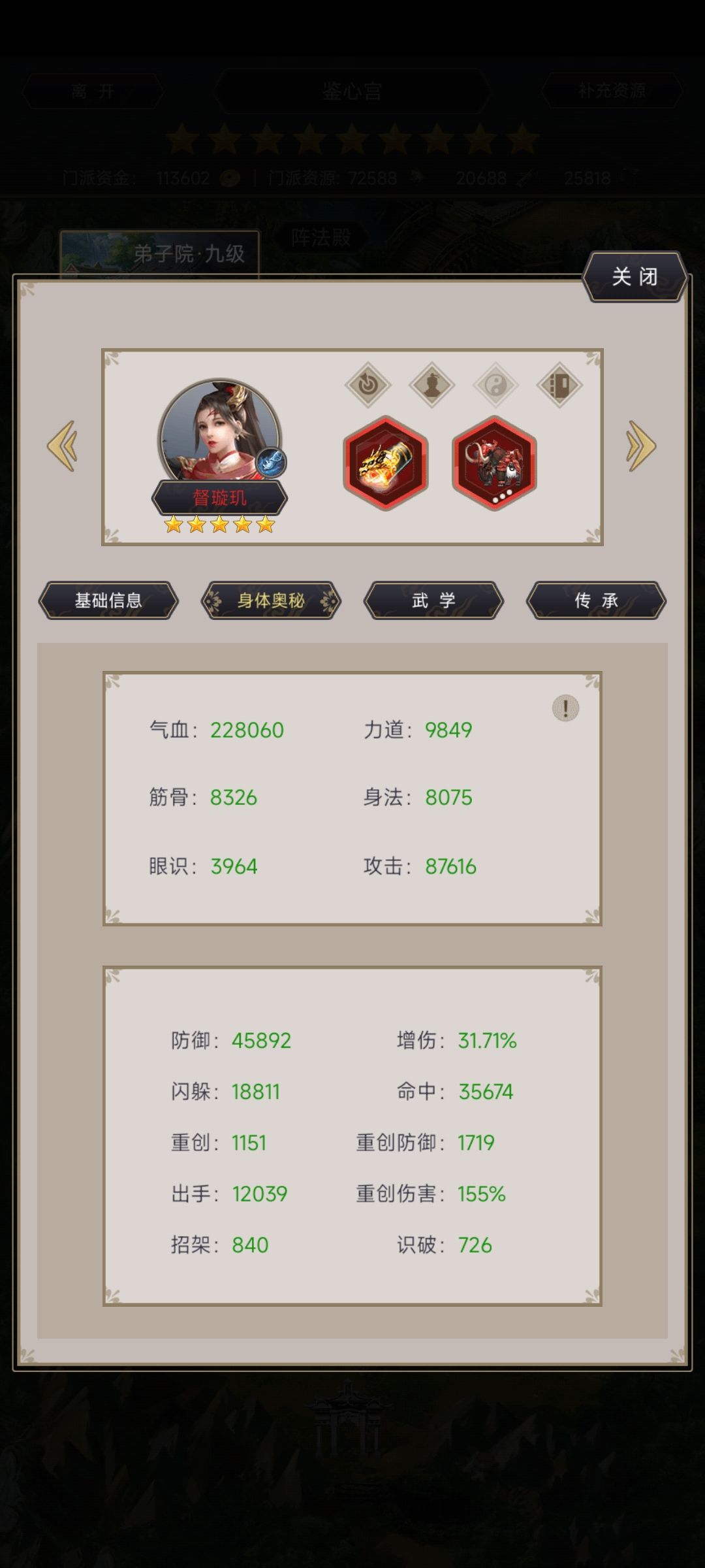 最后的boss战可以外挂弟子,我的棍弟子失败了,只带了腿弟子上阵,我的棍弟子出招率95%,可能得满出招才行,腿弟子满级满阶满出招满磨砺,60腿破,60枪御,单挑胜利还剩一大半血,boss战轻松拿下。其实我的棍弟子除了不是满出招外,别的也都达到了,没单挑胜利有点可惜。两个弟子都有橙色以上重防破防天赋。