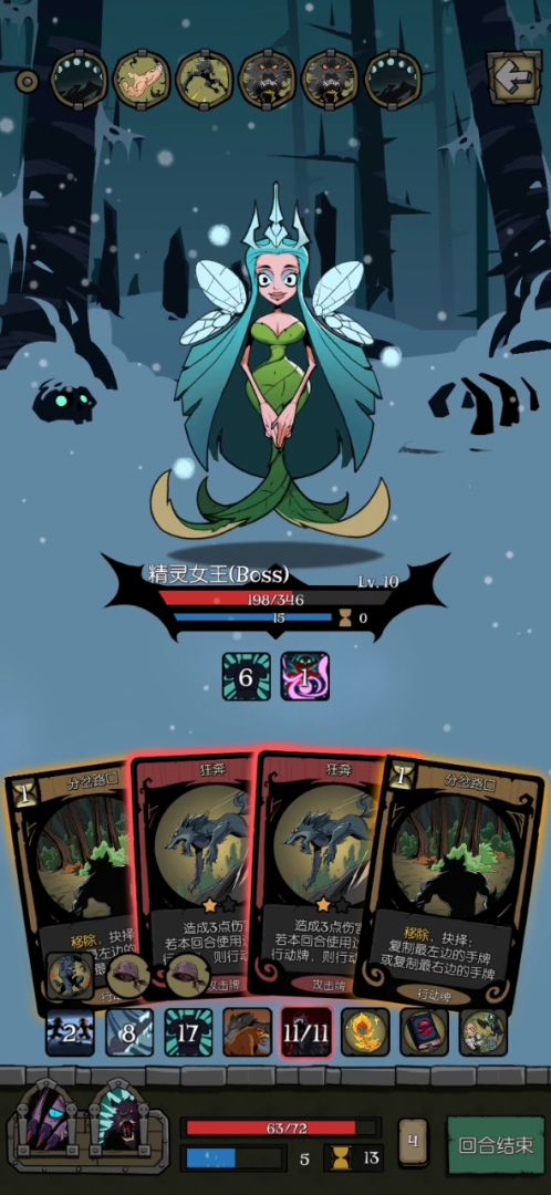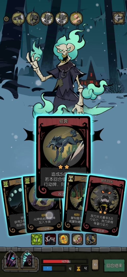 前期:攻击牌“锐利目光”/“狂奔”(加行动力)+“逃避”加护盾防御,装备牌“狼图腾”/行动牌“月光”/“月之轮回”叠加狂怒消耗,删牌为后期做准备;