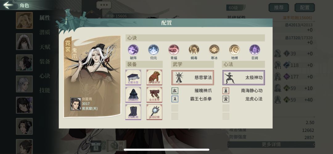 华山pve帖子有点少,我也不是大佬,只是想要给大家推荐一下沉渊刺杀这个组合(注意此玩法适合全门派,最适合华山,最不适合铁石,别杠,亲身体会过),爆发上限绝对是高的,但是脆,某些boss可能需要唐琬扛一下,最好的辅助是甲霓裳。大部份副本单挑就能过。嫌弃攻击力低可以把承影换成绝命,轻蝠换桃华,蚩尤甲换东海衣服,惊天要换龙虎,这个是标准的带法。我的配置是在原有配置上作出优化,目前为止我觉得爆发最高的一套。