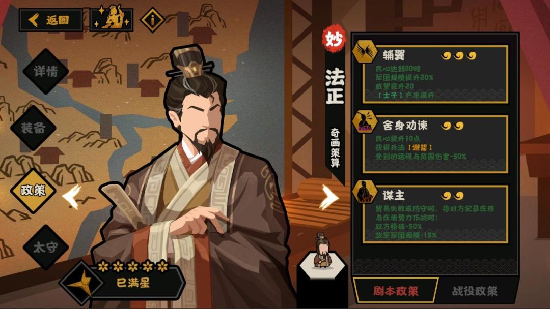 很简单粗暴的政策,属性收益在60(20%军规+20威望),对标汉末三国华佗的五禽戏(50战斗力+10%人口增速)。