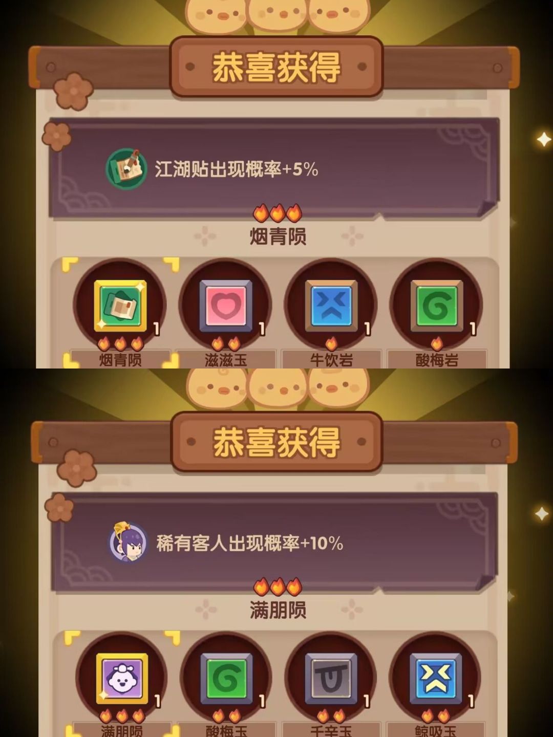 整体思路:速刷得到江湖贴拜帖,领到琉璃,兑换遗玉,运气好会开出满朋陨(稀有客人出现概率+10%),烟青陨(江湖贴出现概率+5%),可以给国家队(满朋陨-贵客国家队,烟青陨-刺客国家队),其他的可以根据遗玉属性给对应厨师(采集加成给采集厨师)