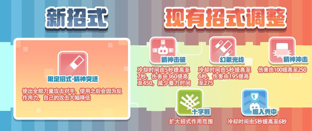 【2】精神击破:冷却时间由5秒提高至7秒,伤害由360提高至450,减少蓄力时间。