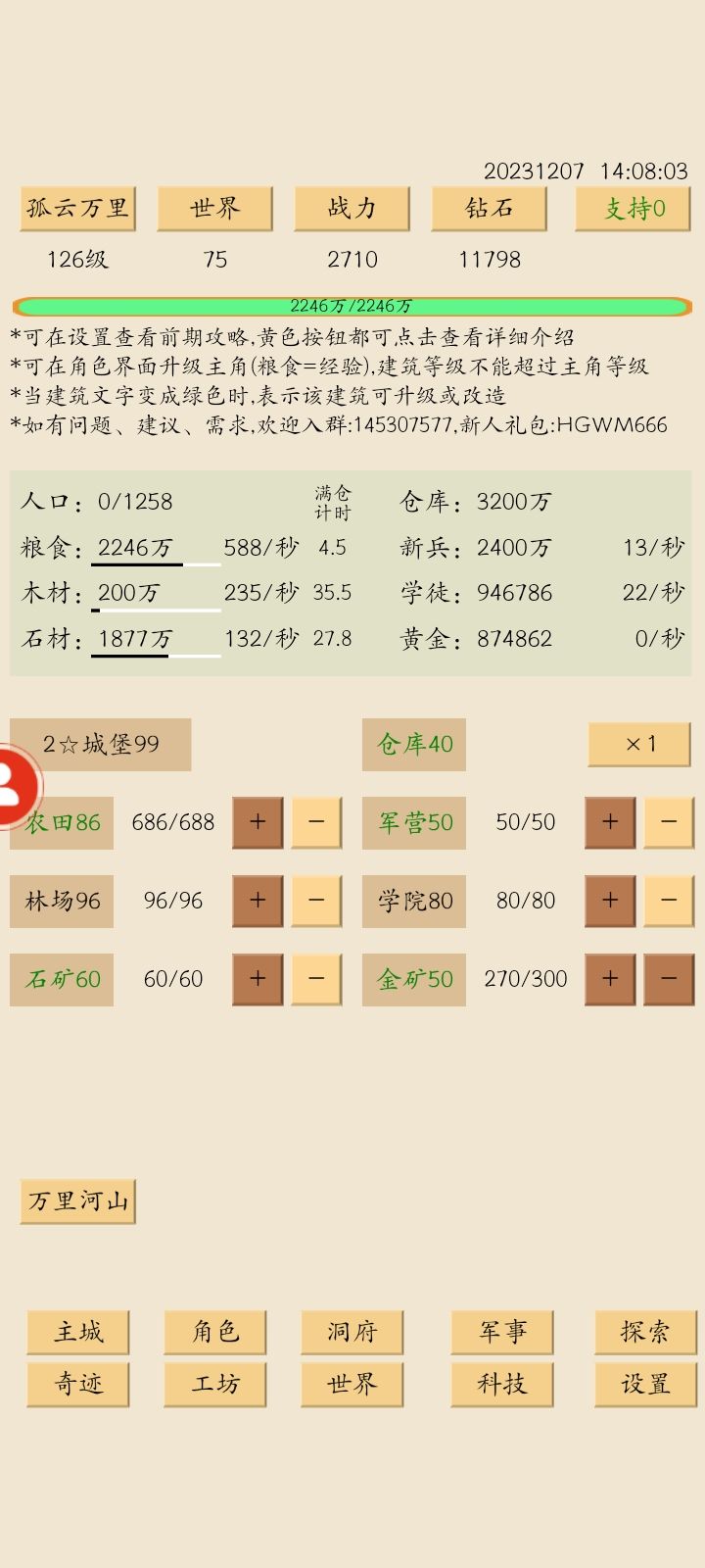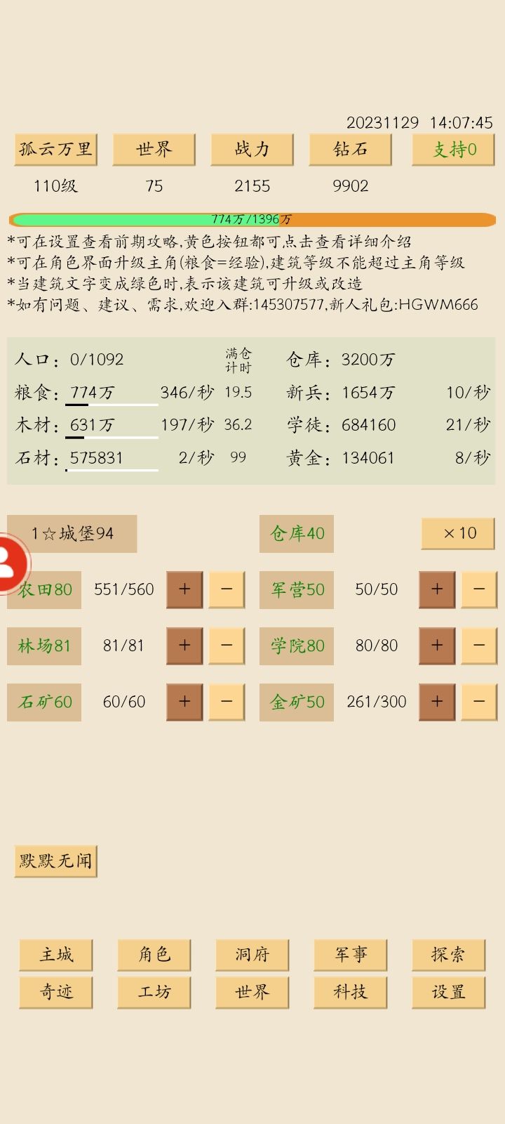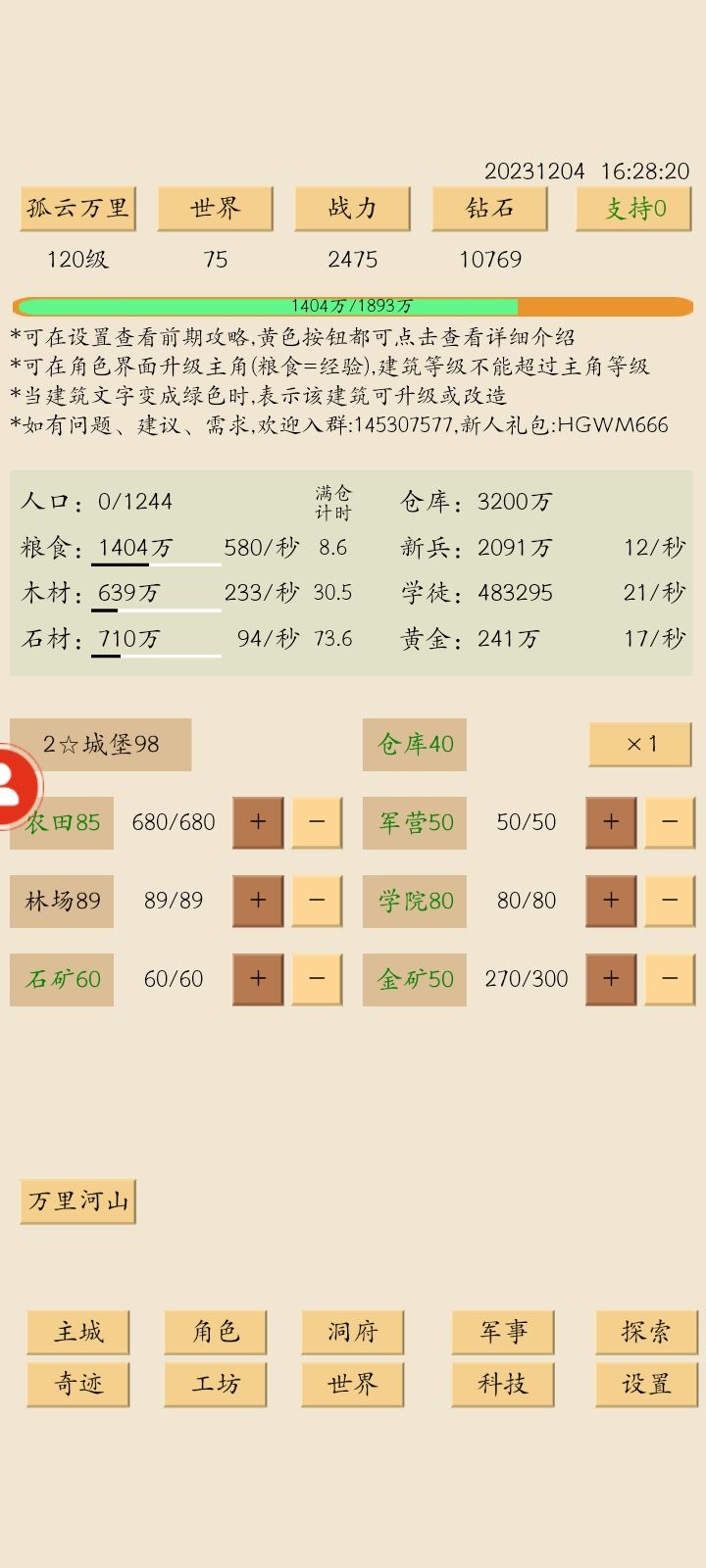 清完图五,开始规划之后的发展,等级依然是最优先项,朝着120级稳步推进。洞府开始提升有点慢,不急。军事招完钢背流浪继续平均升级兵种。科技先搞30采石,接下来一段时间内石需求会比较大,然后50农耕,不然120级改房子后岗位会不够。主城方面,房子先上100,农田等120级再补。