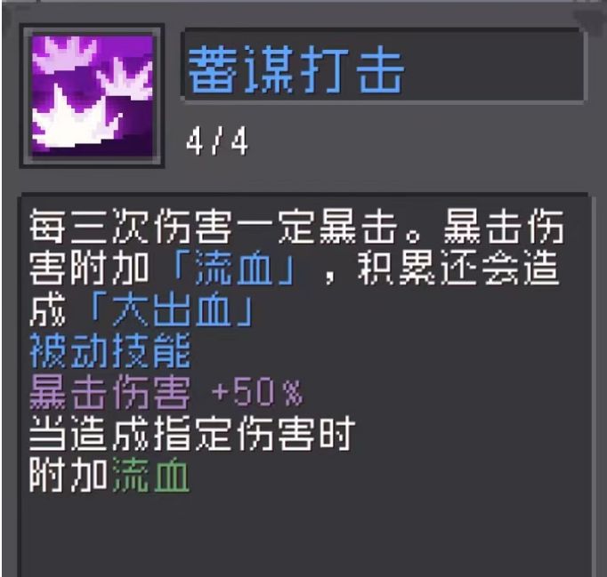记得它三次任意伤害会暴击附加流血,经过测试大出血的固定伤害对小怪大约为10%,对boss大约为2.5% 。