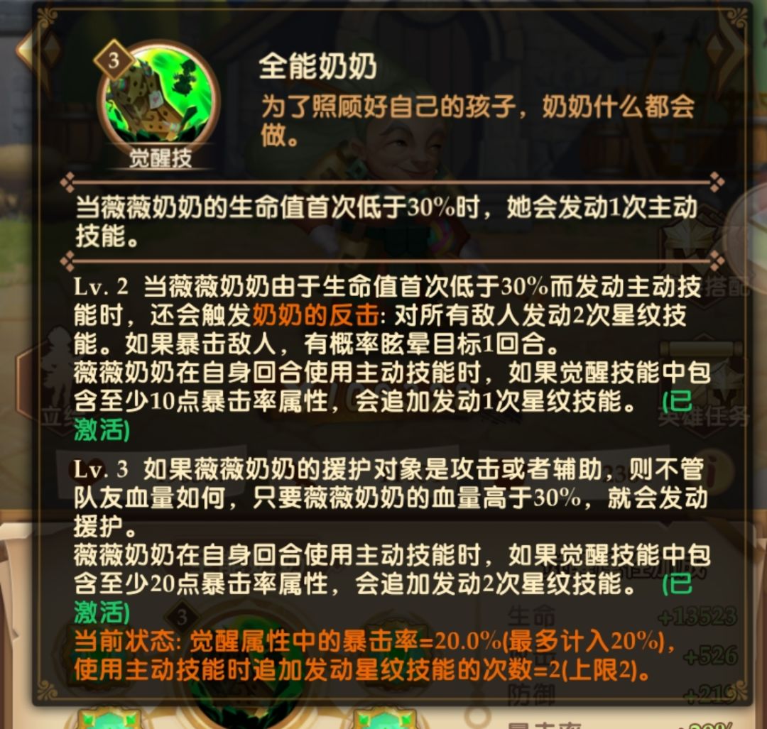 3、有了两次“奶奶的反击”:一个是生命降到30%以下,一个是临死前(如果被对方一次进攻直接打死也触发两次)。这个反击,如果暴击的话有可能让对方眩晕一个回合。怎么说呢,这个设定会让进攻方比较头疼,往往一回合的眩晕就能决定战局。