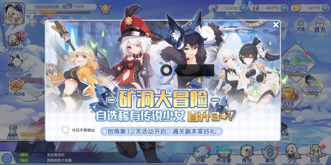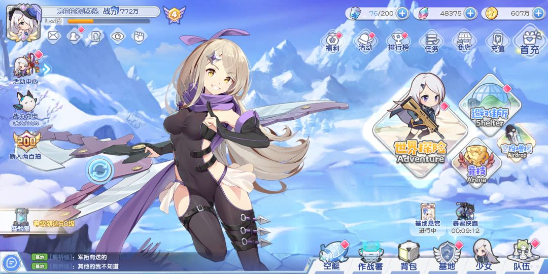 战力:772万,指挥官等级:48级,屯钻:48375,主线:43-9,无限回廊:350关。