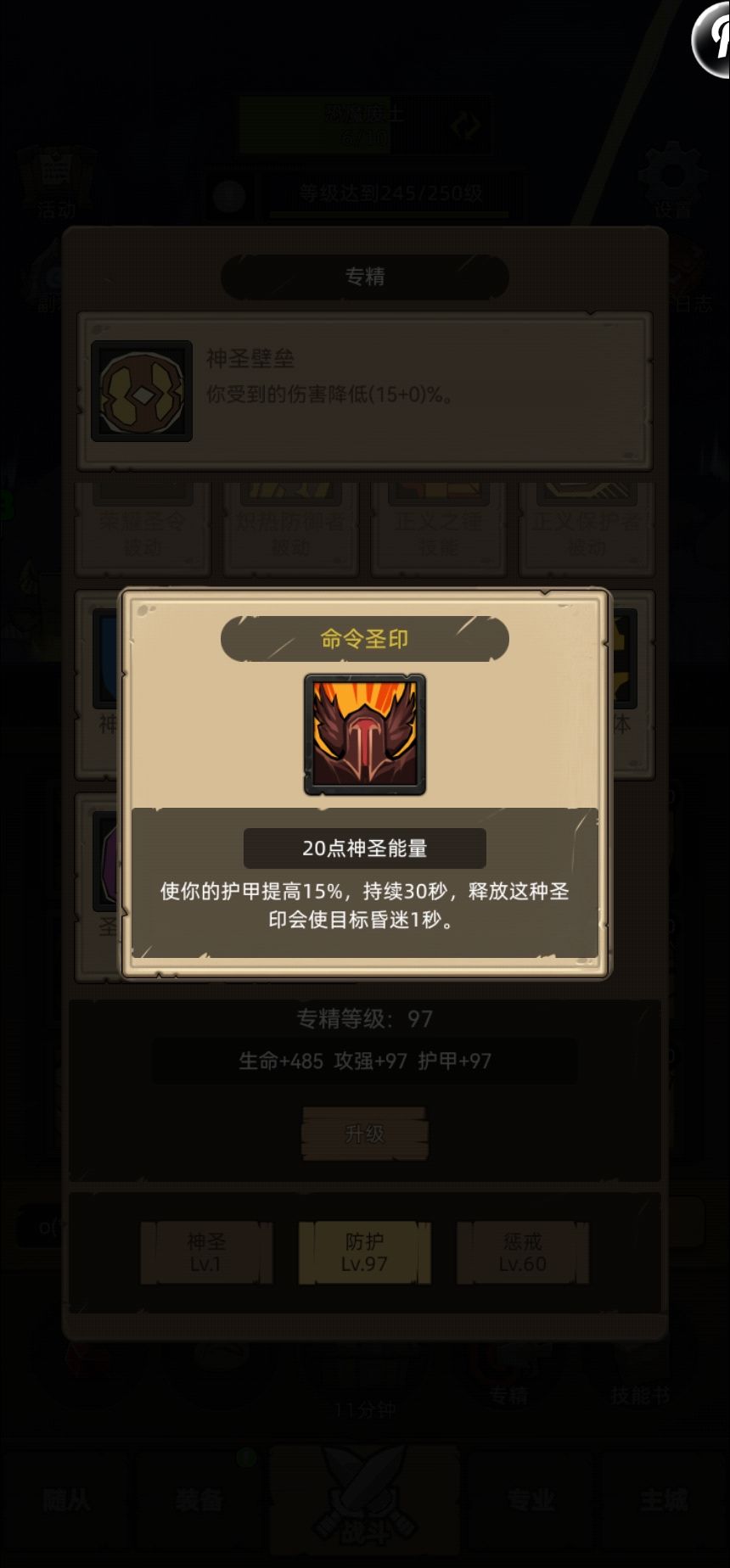 自身正义圣印消耗能量20点,持续时间由20秒延长为30秒