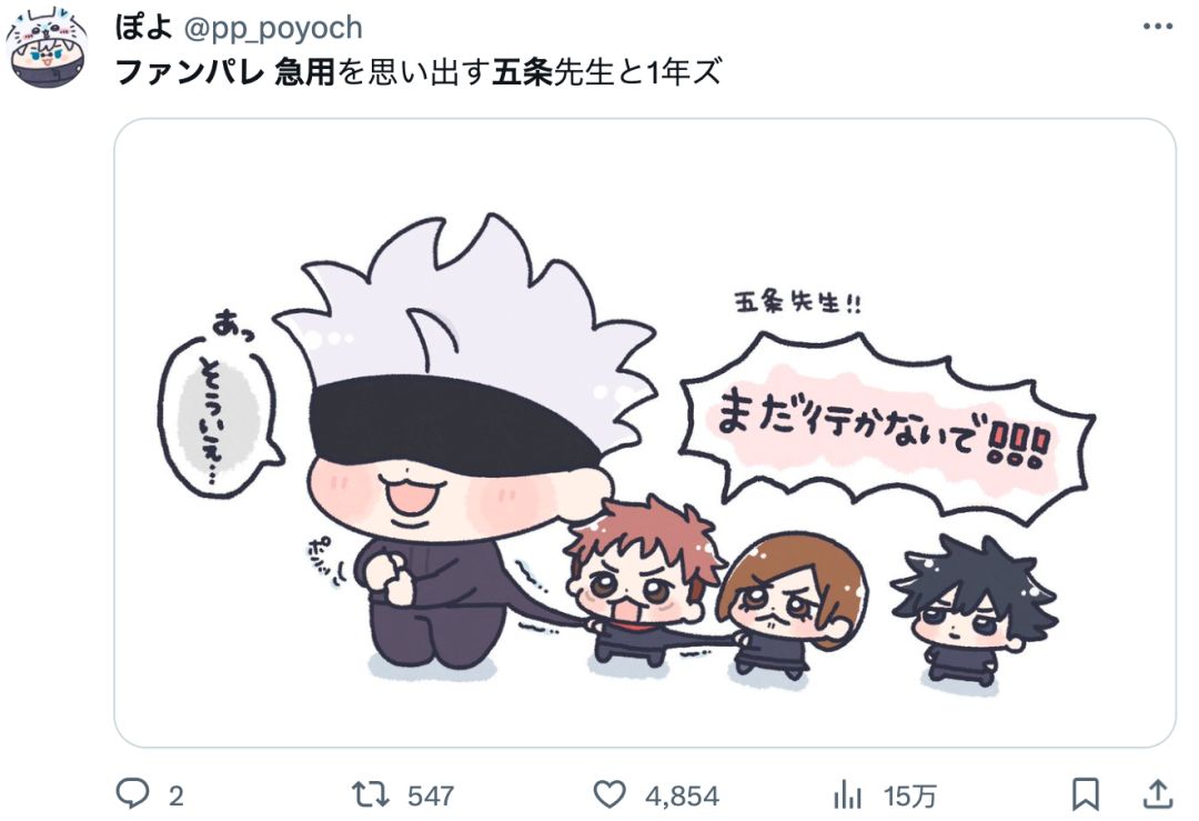 前两天海外上线的《咒术回战 Phantom Parade》手游里,SSR卡五条悟在打完7个回合后就会说自己有急事,然后拍拍屁股闪人......过于离谱的被动技能登上了推特热榜