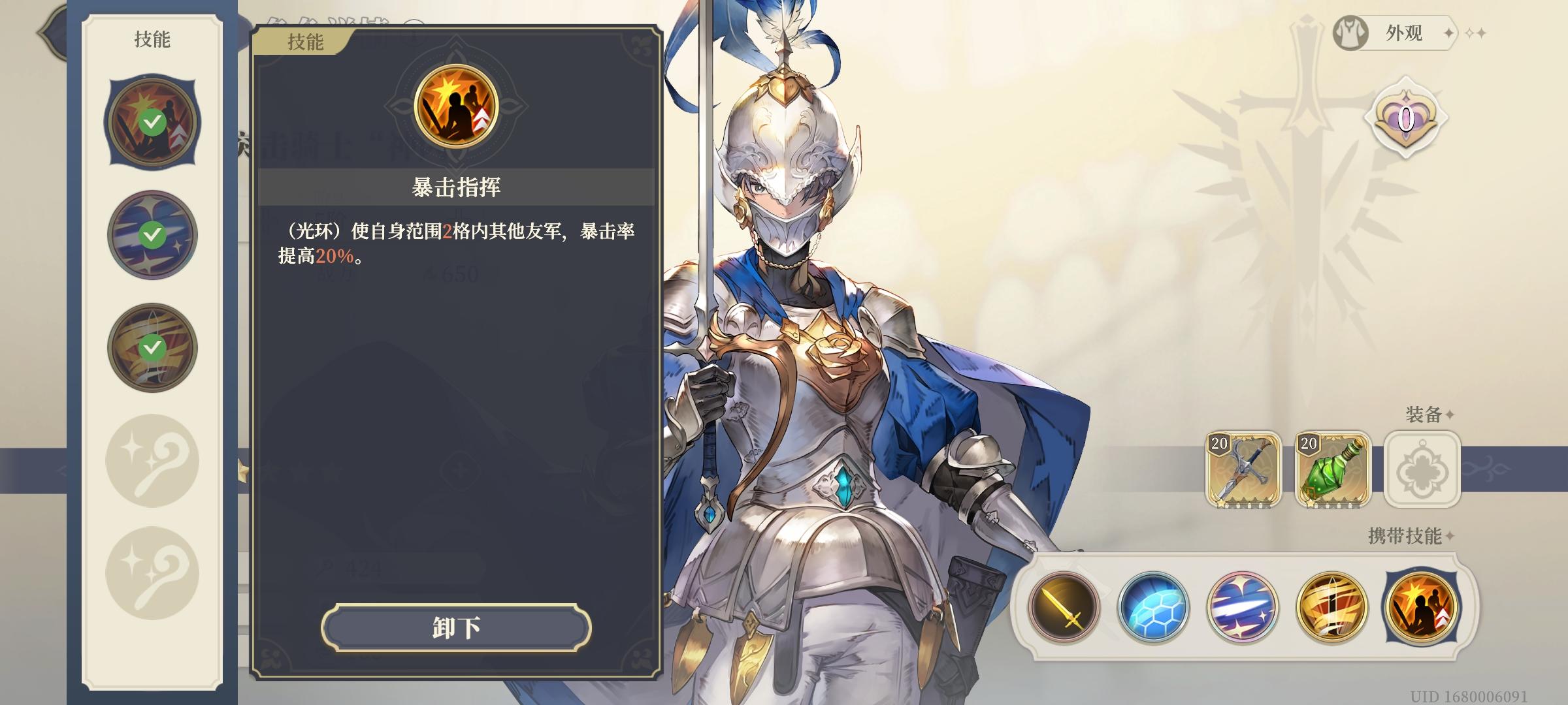 三阶突破技能——暴击指挥(被动),可以让距离自身两格内的友方增加20%暴击率。