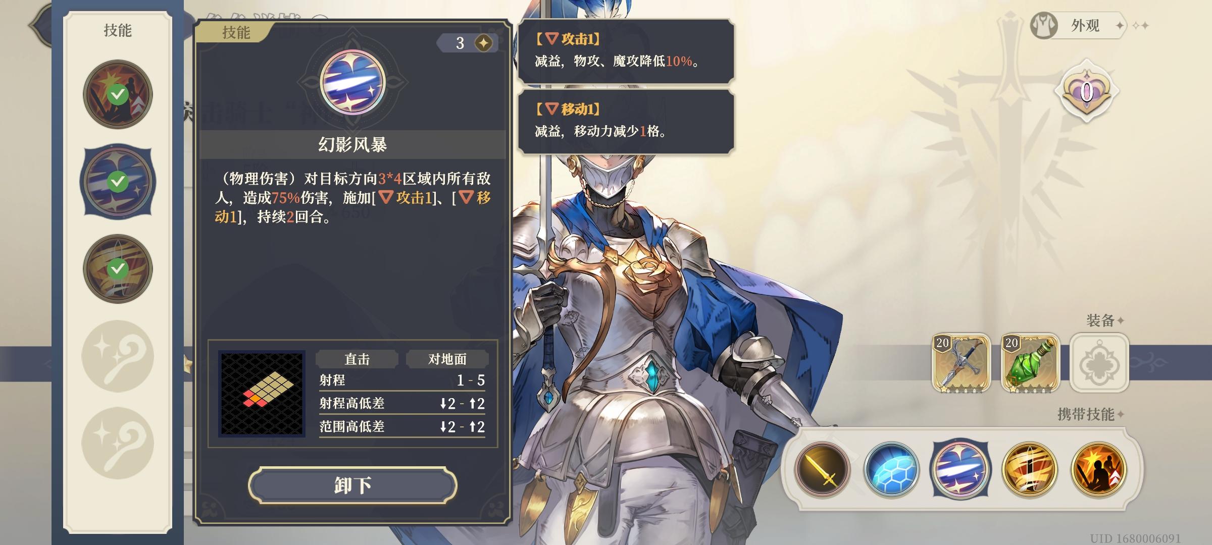 伴生技能——幻影风暴(主动技),这个技能手很长,并且还有两种减益效果:降低范围内敌人10%的攻击力,让其移动距离-1