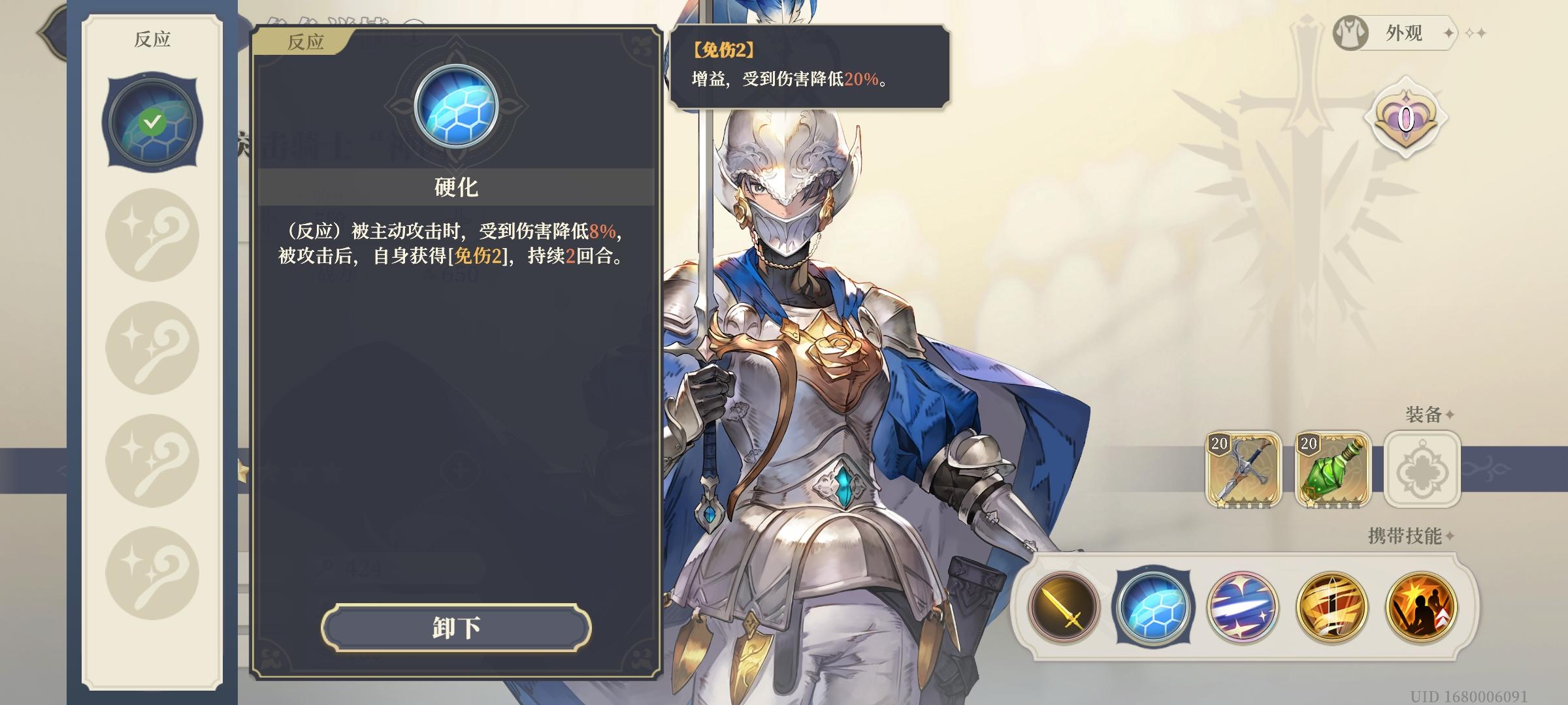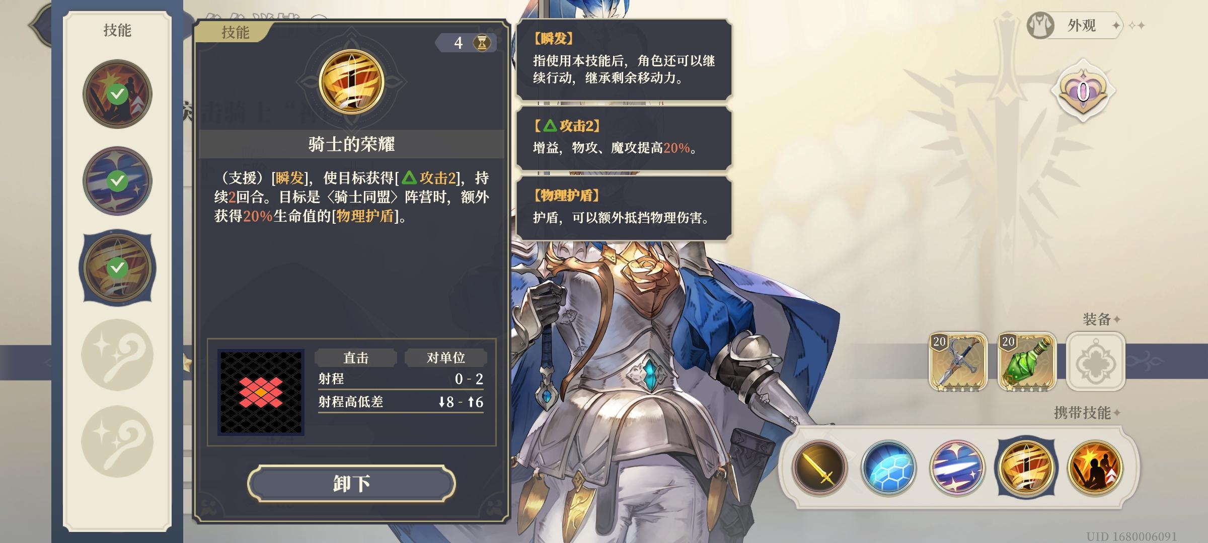 一阶突破技能——骑士的荣耀(瞬发技),为友方增加20%攻击力,若队友同为骑士同盟阵营,还会获得20%生命值的护盾,并且这个技能是瞬发!配合史诗角色“怒风”以及传说角色“歌洛莉亚”都可以起到不小作用。