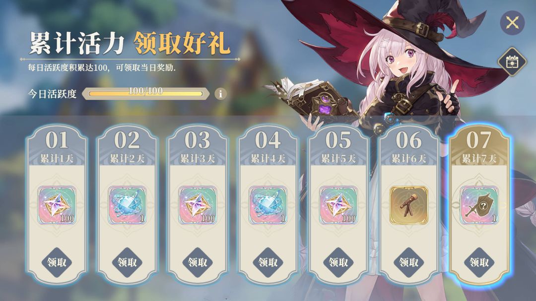 完成每日任务,活跃度累计达到100,可领取当日奖励!
