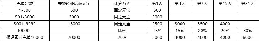 1、原账号累充一万以下用户返还固定元宝,充值金额3001以上的元宝返利需分批次发送,于新角色创建的第1天、第3天、第7天、第15天、第21天发放固定数量元宝;
