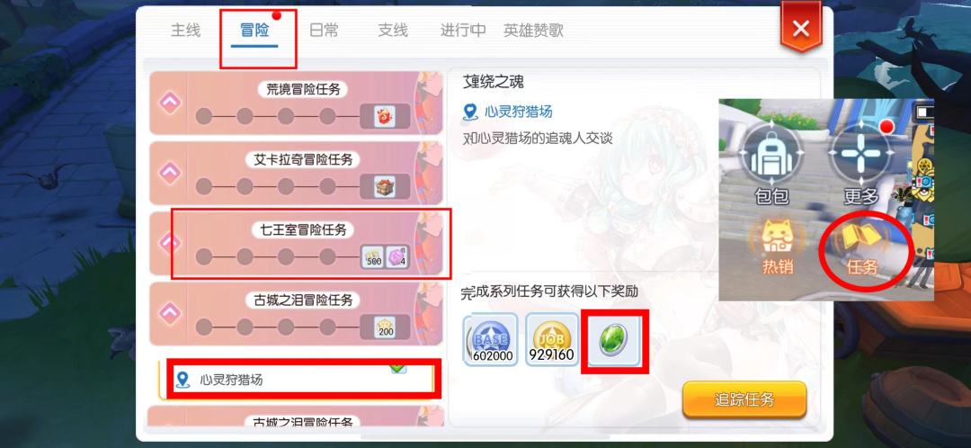 7.点游戏右上角的任务,进入冒险,点开七王室的冒险任务,看一下哪个任务给紫材料猫眼欧珀(价值24w左右),如果对job经验有需求,可以把这个图里其他几个(除了拼图,太复杂了)都做了,这里的日常冒险任务都非常简单,习惯后只需要看着电视点几下就全部结束了且job经验可观。全程只需2~3min。
