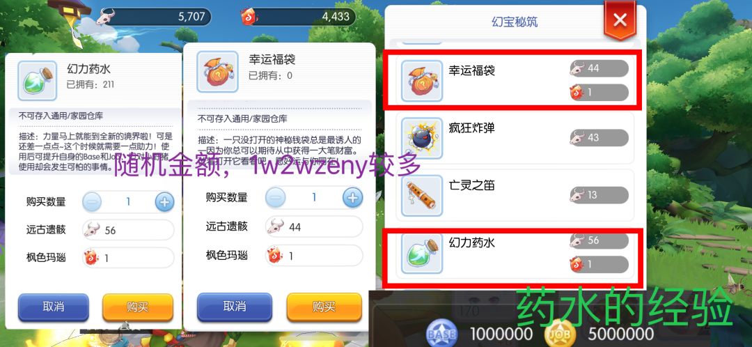 之所以来这里刷箱子,主要是为了刷可以兑换幻力药水(每一瓶100w base 500w job经验,这个的job超级多的)或幸运福袋(随机金额1w2wzeny较多)的材料。因为这个版本大家都不会在荒境挂机了所以兑换材料的获取方式基本只能靠这几个箱子了。在如地图所标的藏宝阁处兑换,记住不要去镜像的。