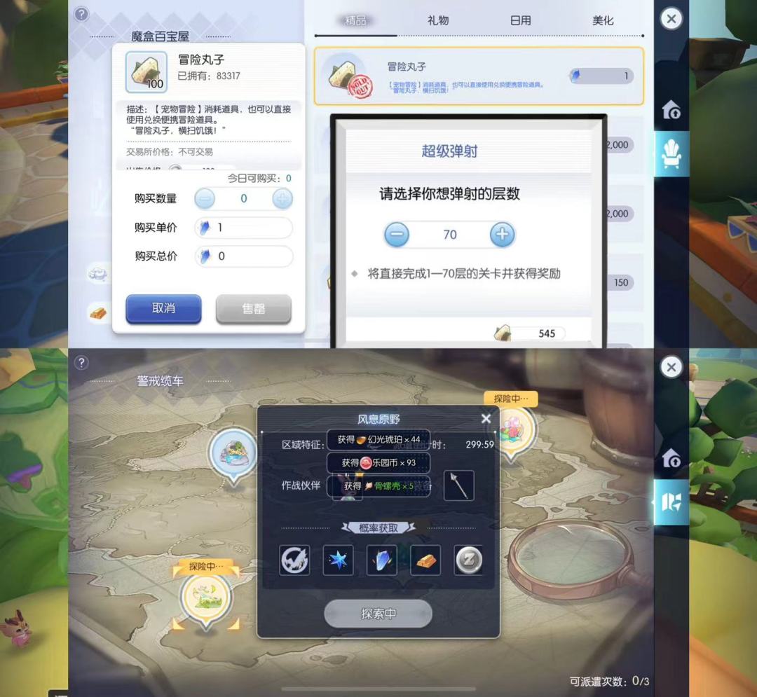5.趁等待时间前往克魔岛的云海群岛,去百宝屋兑换每日的冒险丸子,可用于每周弹射70层的塔以节省时间,这样自己走完剩下30层即可。之后去警戒缆车找npc帕帕洛做每日的3次派遣,派遣需要消耗冒险丸子,永动。派遣任务不止可以获取乐园币来兑换流程3的材料,还可以获取少量其他材料以及偶尔会给紫色材料(沉船宝藏,神秘眼镜17~20w)。