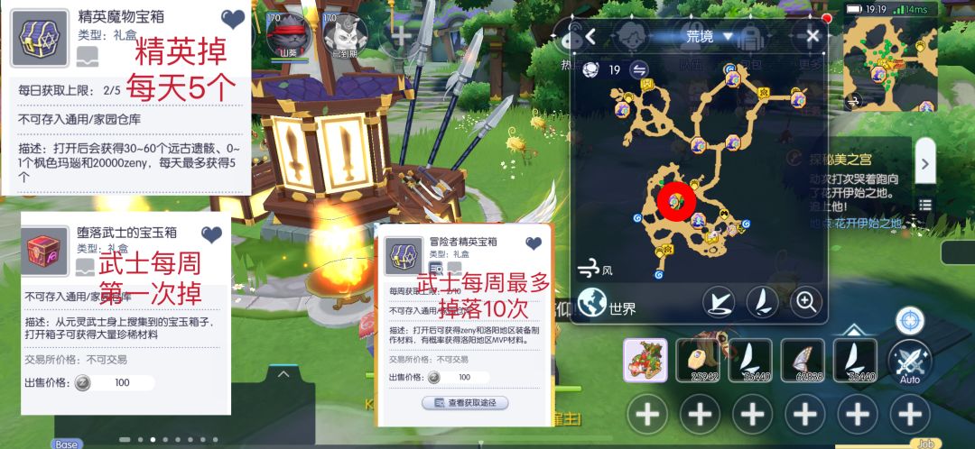 8. 同页面如果对于job经验有需求,去荒境做最简单的杀怪任务或者对话任务。顺便杀几个精英拿精英宝箱,5个一会就刷满了,里面有zeny和材料。