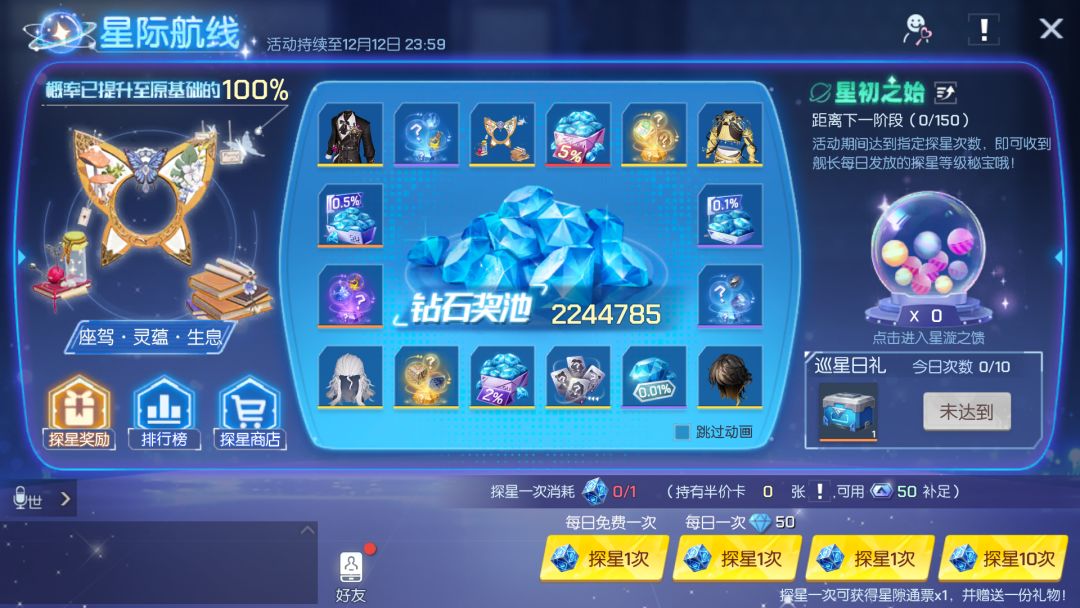 11月30日至12月12日23:59,星际航线带着舰长的钻石悬赏池强力来袭!参与星际航线将有概率瓜分钻石悬赏池中的大量钻石,更有大奖座驾·灵蕴·生息、时装·瑰华之庭·衣、发型·瑰华之庭·发、头饰·瑰华之庭·头饰、返场时装·哈托尔秘辛·衣、返场发型·哈托尔秘辛·发、返场头饰·哈托尔秘辛·头饰、手办·零-暮歌、头像·桃花小兔、头像框·魔星之夜等奖励!