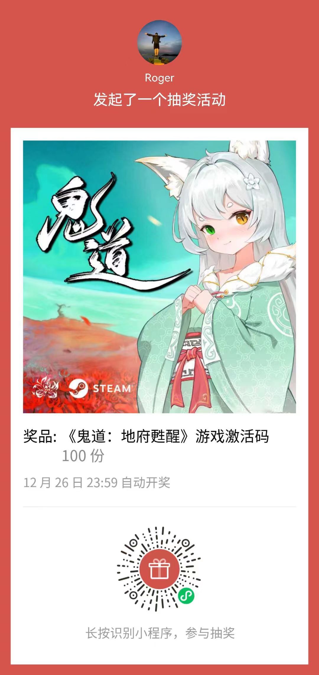 本次活动截止12月26日,自动开奖,直接发放CDKEY!