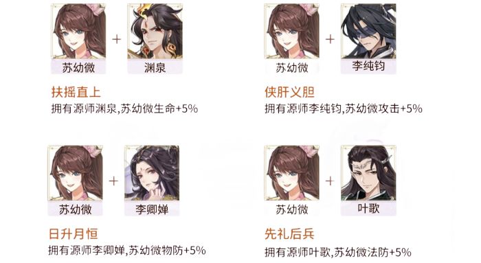 比较实用的是金卡武煌,主要条件太过苟刻吃的是2蛟2雀气运,意味了需死绑雀,不过给出的加成却十分亮眼,对蛟气运者提升15%暴伤,而对于苏幼微这个暴击怪来说最吃的还当是暴伤,已经早早满足暴击需求的想要拓展伤害稳定高输达到收割目的,暴伤无疑是最“解渴”的,另外给武煌对蛟运的评价一直都是极高的,是作用在苏幼微头上的,并且2蛟2雀难点在于“2雀”而玩苏幼微是必须要上雀运的武瑶的这俩死绑,而玩苏武后期是必须上雀运的炎帝萧炎的,一般有苏幼微的队都不缺少雀角,所以以苏幼微角度上来说,前期是需要甄虚来提升气运的,后期成型也吃武煌来提升气数,在气运羁绊方面,苏幼微吃抹的那是相当干净了。