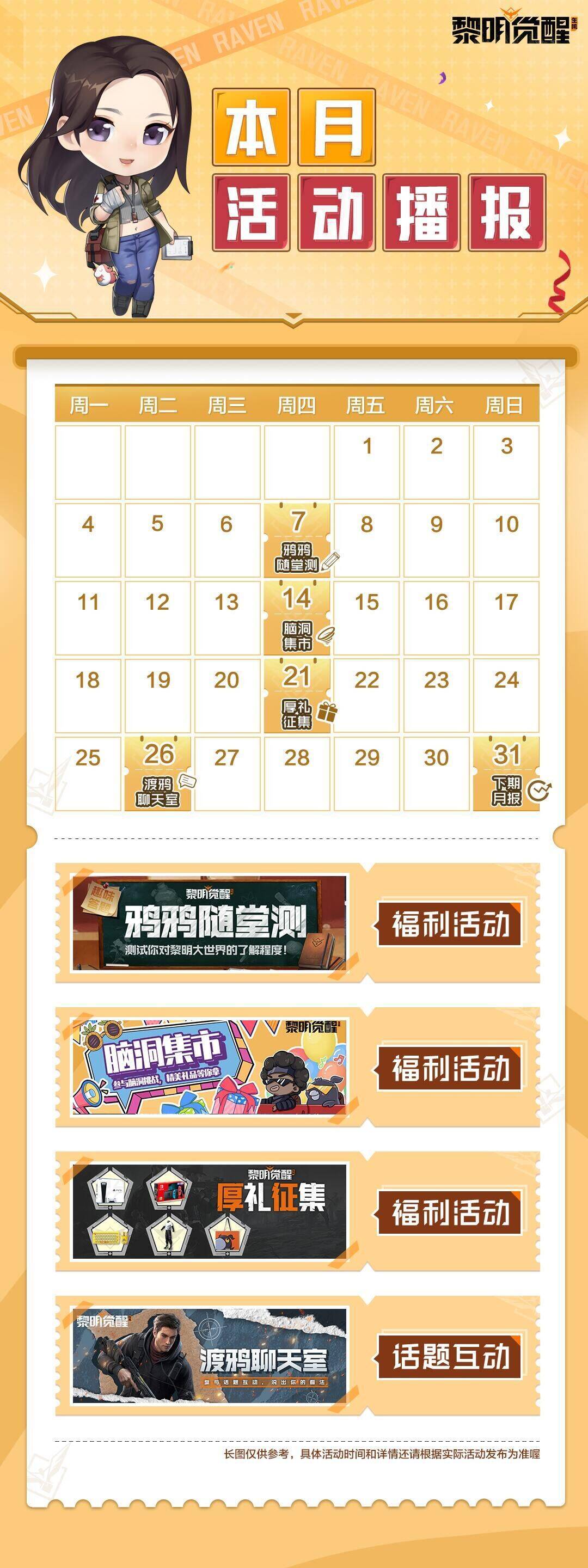 暴风将至,危机四伏。鸦鸦从不亏待勇于挑战的幸存者,所以特意准备了些福利活动,等着大家参与互动赢取奖品!不仅有【鸦鸦随堂测】趣味问答、【脑洞集市】解锁新奇创意、做客【渡鸦聊天室】分享大世界趣事,还有大型征集活动重磅来袭!并且鸦鸦打听到这次大型征集活动的奖品有PS5游戏机、NS掌上游戏机、洛斐小黄鸭键鼠套装等多重好礼~